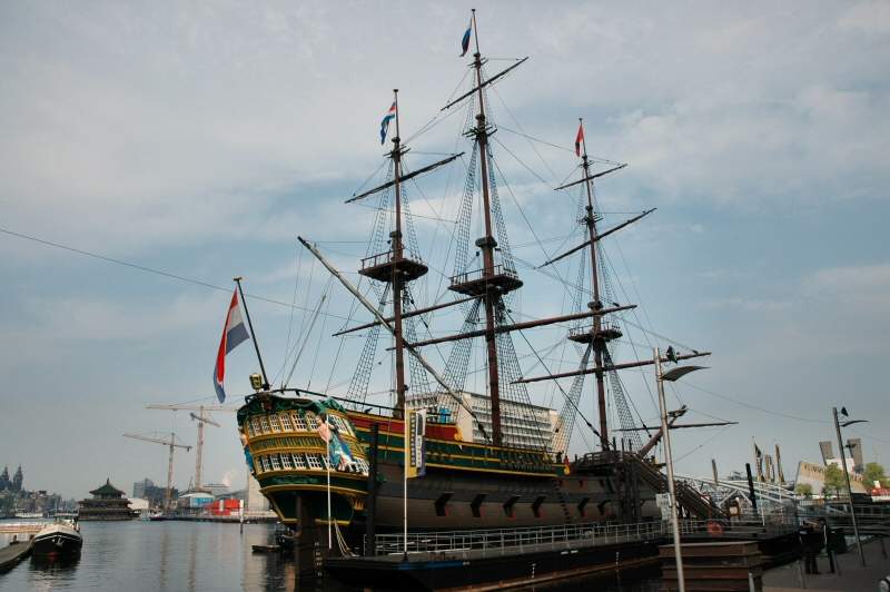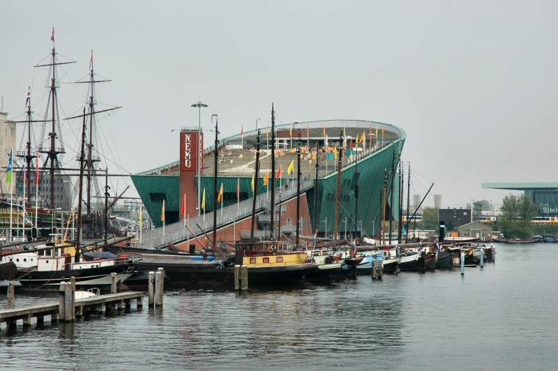 Besøk også den gamle gallionen like ved. Her kan de yngre klatre ombord og leke sjørøver. - Foto: Gaute Nordvik NEMO ligger i en svær grønn bygning, kun femten minutter fra sentralbanestasjonen. Det spennende bygget som kan minne litt om en båt, er designet av den italienske arkitekten Renzo Piano. Vitenskapssenteret som ble åpnet i 1997, er et godt eksempel på den nye arkitekturen som nå spretter opp ved breddene til IJ.